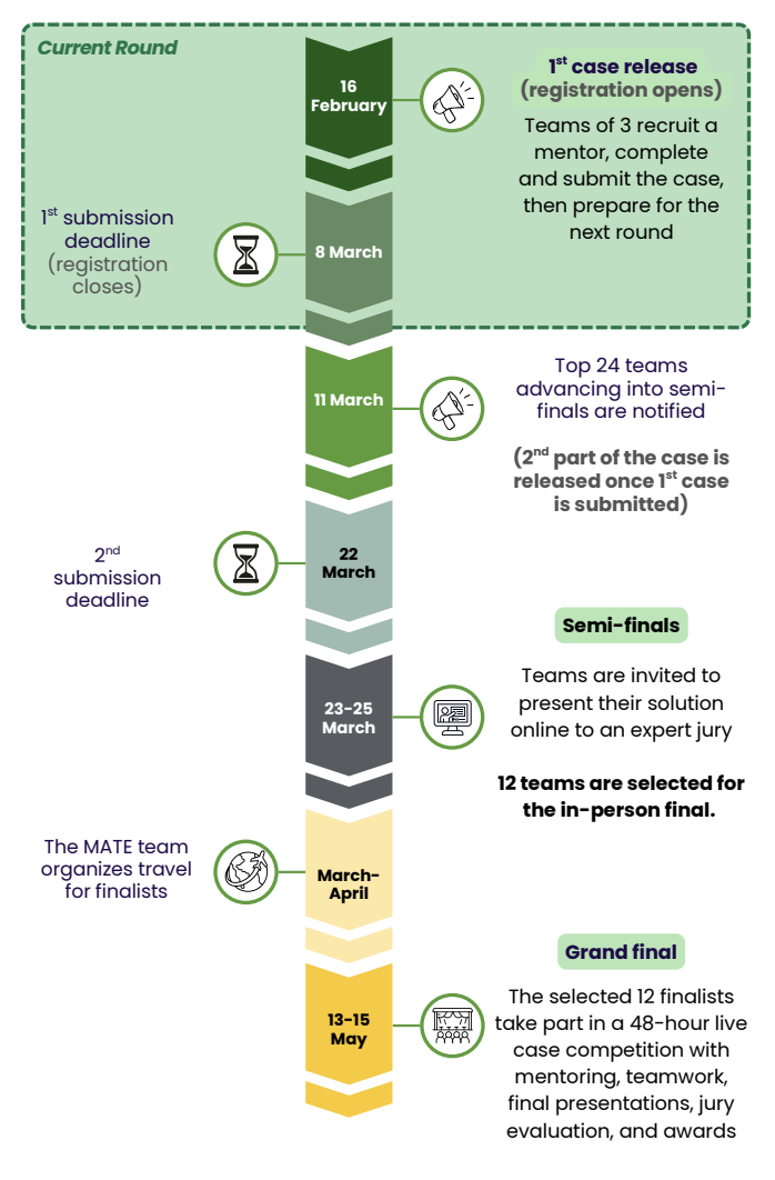 A 48-hour live case competition: teamwork, mentoring, final presentations, jury evaluation, and awards. During the on-site final, teams will also receive professional support from MATE and industry partner mentors, who will provide academic and industry guidance throughout the competition.